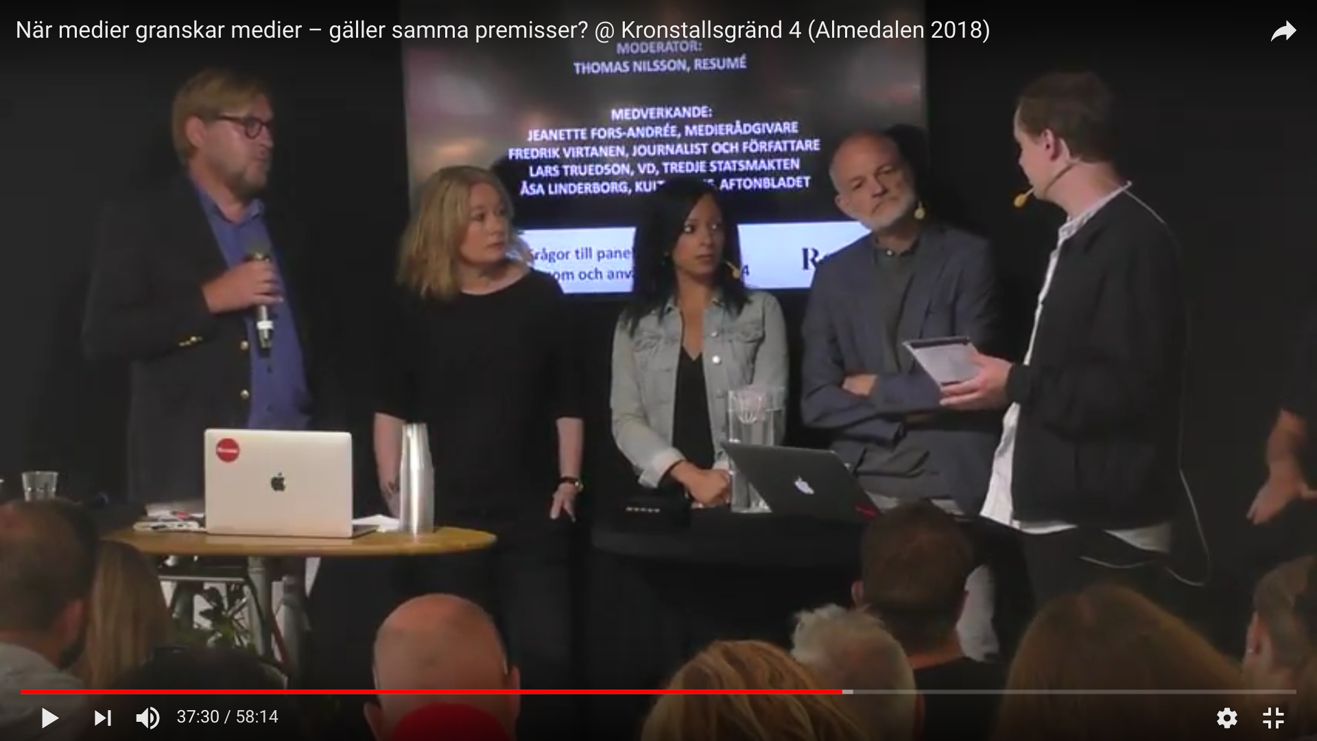 Jag har även stått på SVT-scenen i Almedalen och debatterat med Uppdrag Gransknings Janne Josefsson och Sophia Djiobaridis och menat att förnedringsjournalistik med offentlig avrättning som affärsidé är något helt annat än att utkräva ansvar. Och jag har debatterat om mediedrev och vilka konsekvenser det får för de som drabbas, bland annat i en panel om #metoo tillsammans med Fredrik Virtanen, journalist (tidigare Aftonbladet) och Åsa Linderborg, kulturchef på Aftonbladet.